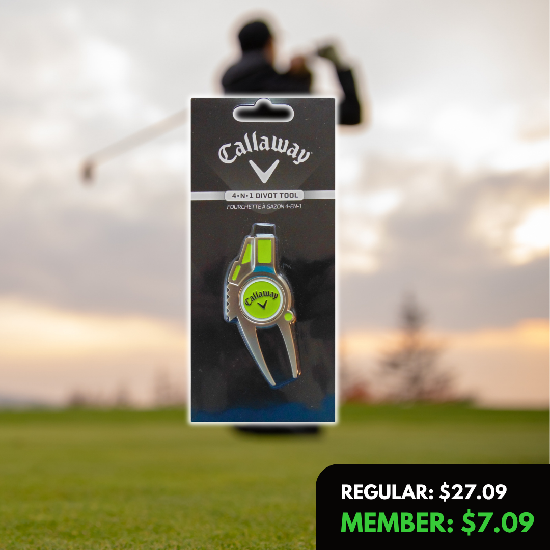 Master your course etiquette with the Callaway 4-in-1 Divot Repair Tool, the all-in-one essential for every round. Designed for durability and precision, this tool combines a divot repair fork, magnetic ball marker, club brush, and groove cleaner — everything you need to keep your gear and the green in top shape.