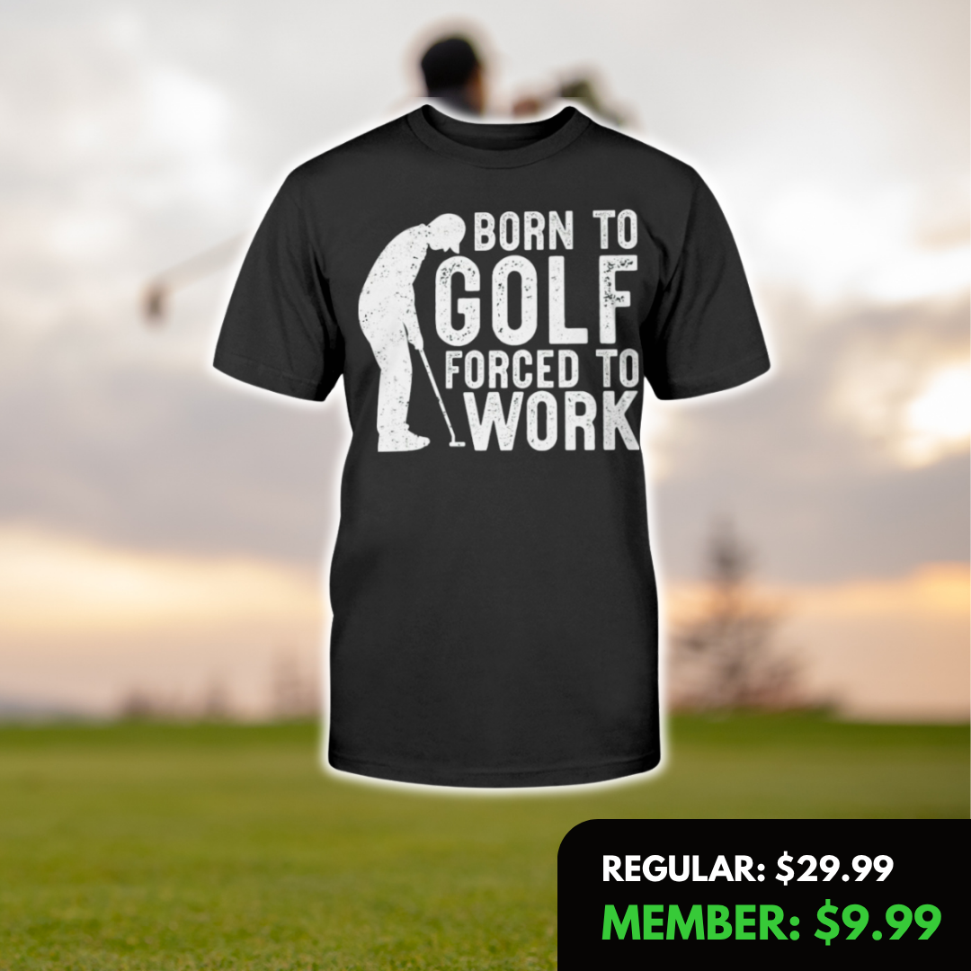For those who dream of fairways while stuck in spreadsheets, this “Born to Golf, Forced to Work” tee says what every golfer’s thinking. It’s the perfect mix of humor and honesty for anyone who knows their real calling comes with a 9-iron, not a 9-to-5.